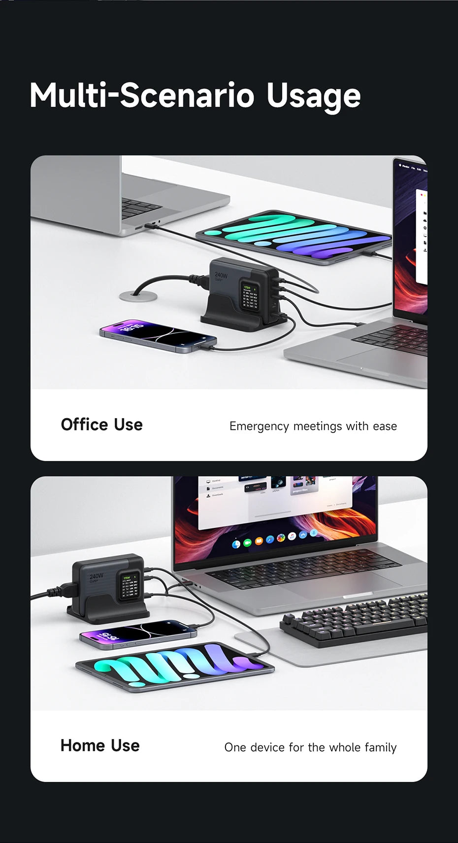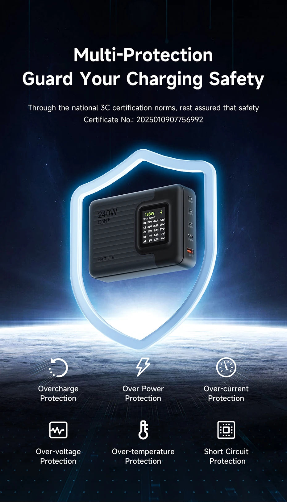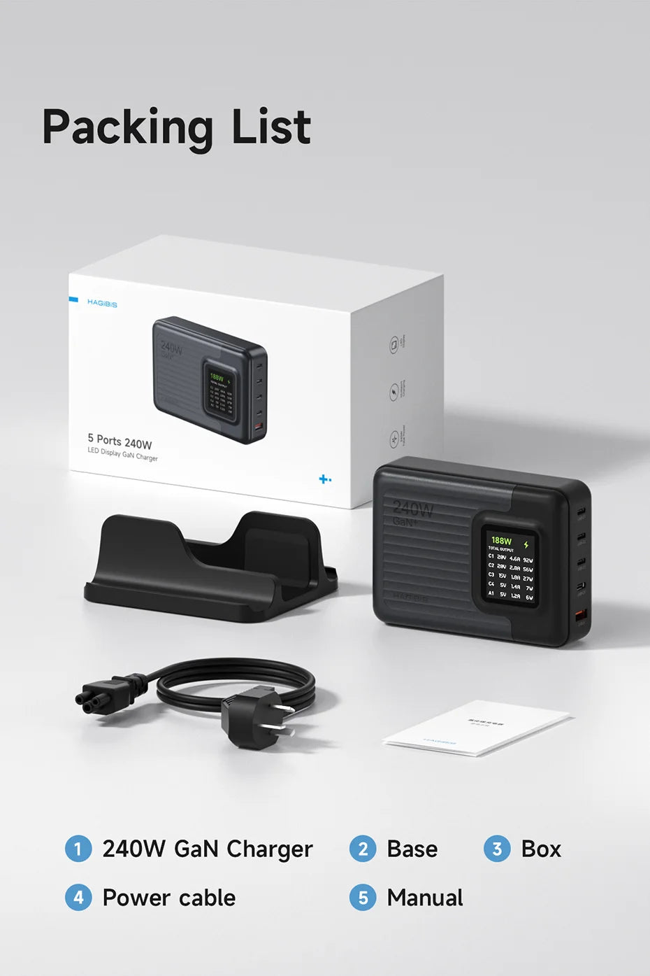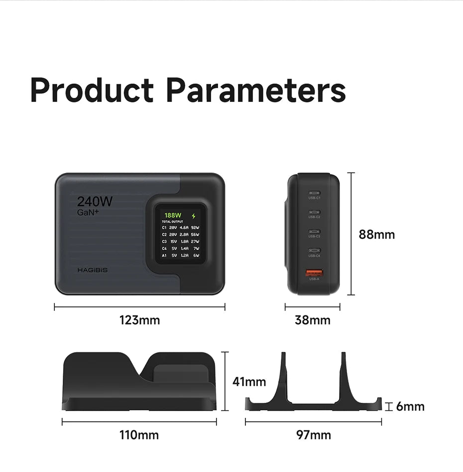 Hagibis 240W USB C Charger 5 Ports GaN 140W PD3.1 Fast Charger Desktop Charging Station with LCD Display For MacBook Pro Laptops